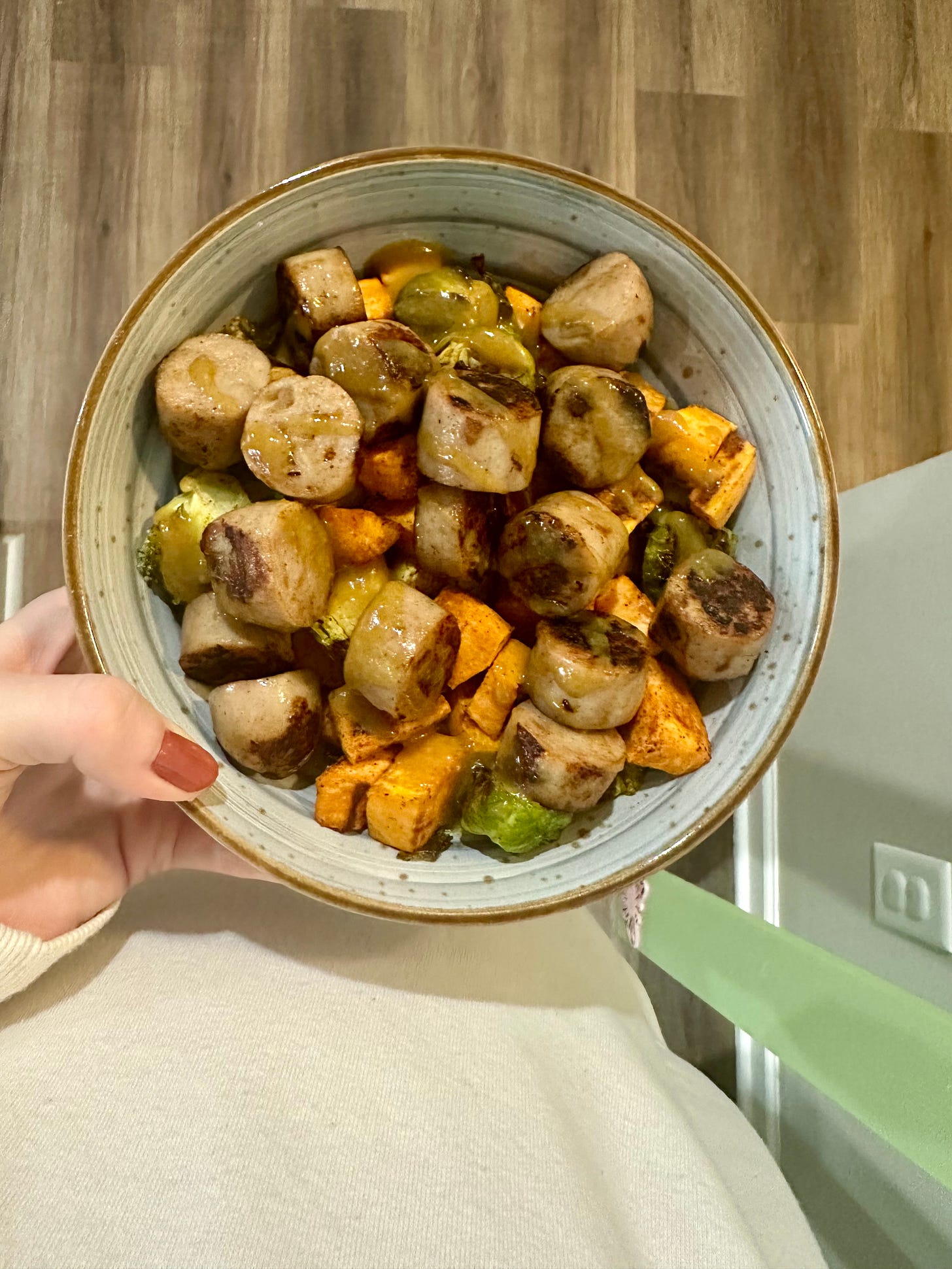 Meal #2: Chicken Sausage + Sweet Potato & Brussel Sprouts + Maple Mustard Sauce 🍠